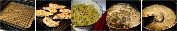 First Cook the pasta according to package (Al dente) then drain. While pasta is cooking, prepare the chicken. Using a 12-inch skillet or stove top grill heat 1 tablespoon olive oil. Split the chicken breasts, so they're not so thick. This will help them cook more evenly.