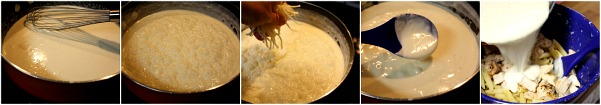 In a separate large skillet melt the butter; add the onion and garlic and cook for 1 - 2 minutes. Add the flour and mix using a wire whisk. Mix until bubbly and it starts to take on a bit of color.